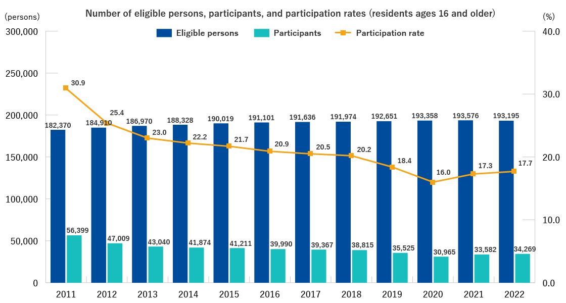 - The participation rate of those ages 16 and older was 17.7% in FY2022. Compared with the rate of 17.3% in FY2021, it was a 0.4 point increase. The main reason for this increase is thought to be that those who had refrained from receiving a Health Check due to concerns over COVID-19 infection began to participate in FY2022.