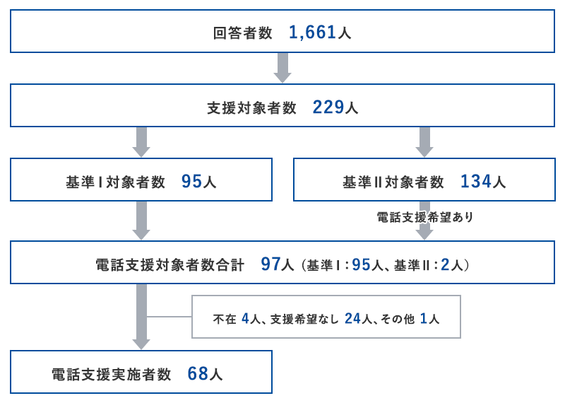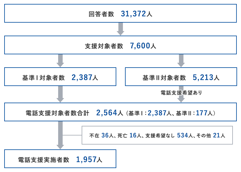 - 質問紙調査結果に基づいた様々な支援を継続して行い、特に電話支援については、令和5年度は約2,000件の架電支援を行い、現在までにのべ4万人以上の方に電話支援を実施してきました。